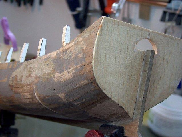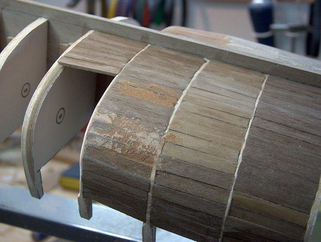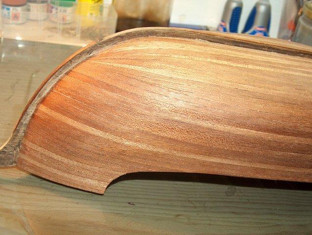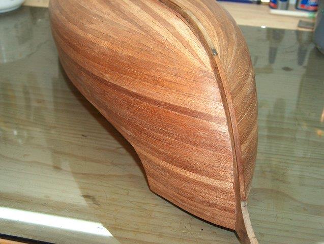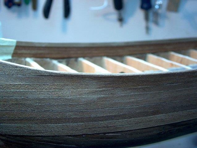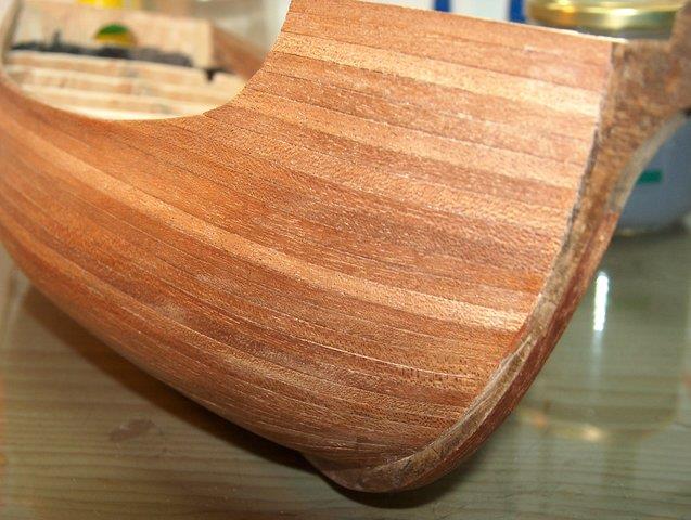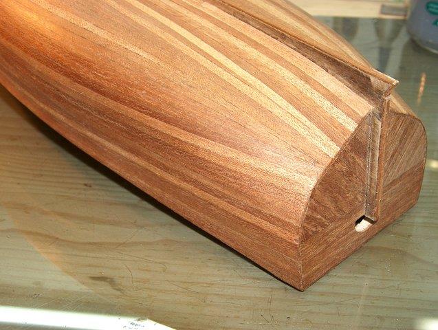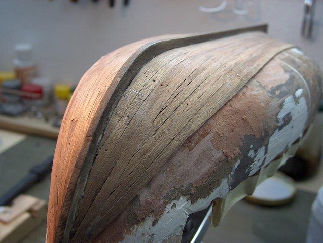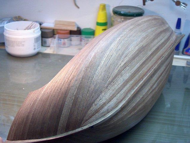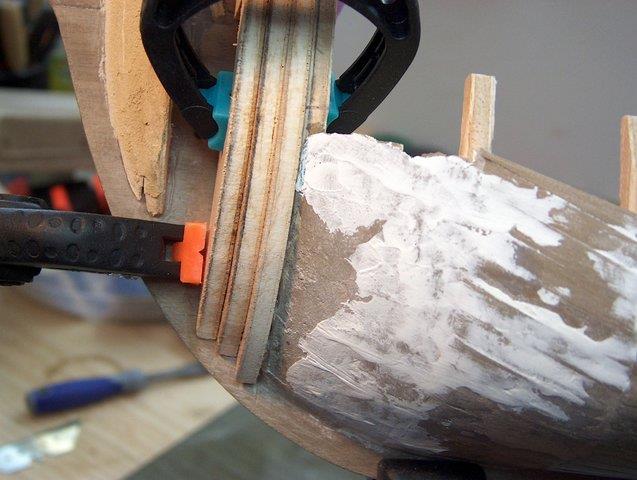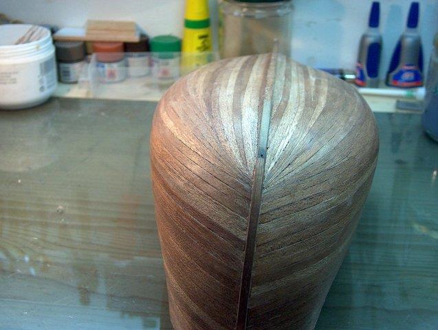 une méthode originale pour obtenir le premier bordé : collage de bouts de baguettes ! un excellent collage est obtenu en chanfreinant les couples et les bouts de baguettes. Ensuite, un bon ponçage et de l'enduit ... pour le bloc avant, épaisseurs de contreplaqué, ponçage et enduit ... |