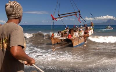 ""Il a fallu moins d'une heure lundi matin (19/04/10) à l'entreprise Mollard et à l'équipe de la pirogue "Upo'o Tahiti" pour mettre à l'eau le géant de neuf tonnes.