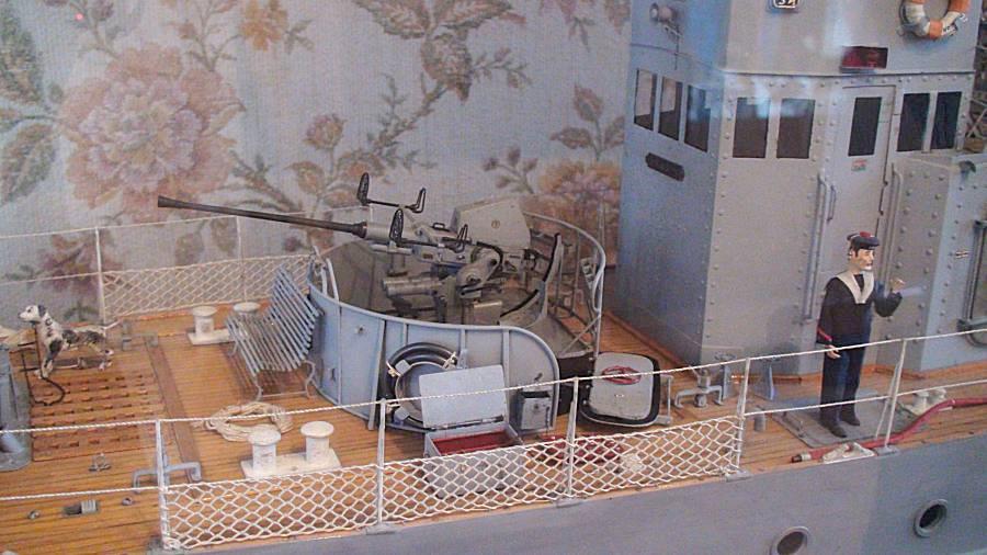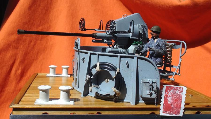 | Canon de 40 mm Bofor de marine, au 1/25ème. Cette pièce est radio-commandée qui se dirige en visée et peut tirer 4 coups (plombs). Les servants sont articulés, ils ont même les lacets aux chaussures. Le canon est interchangeable avec celui monté sur un chasseur de sous-marins (voir plus loin).