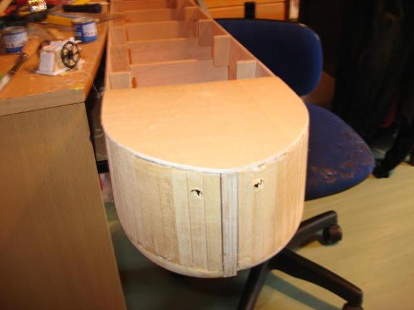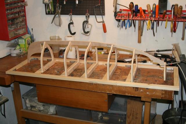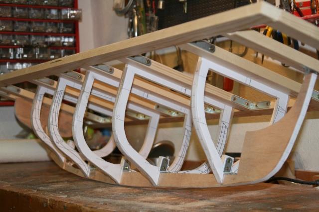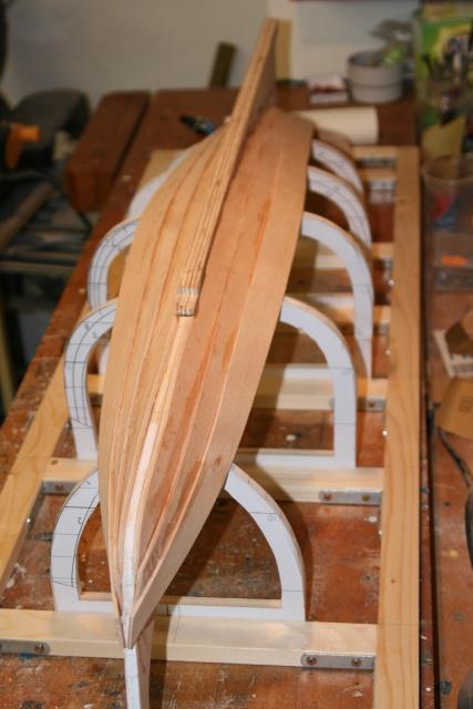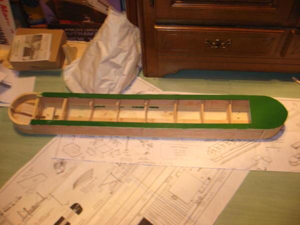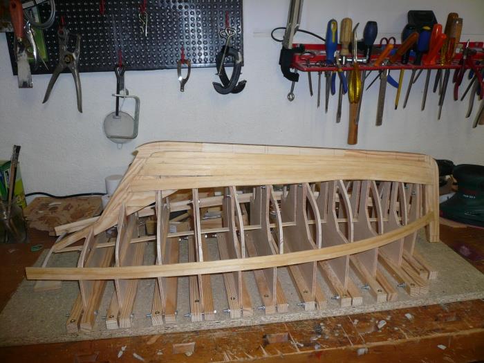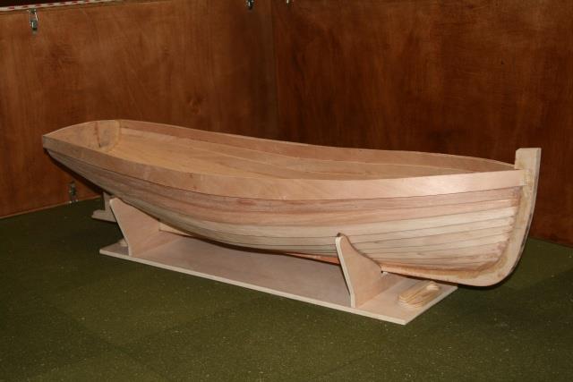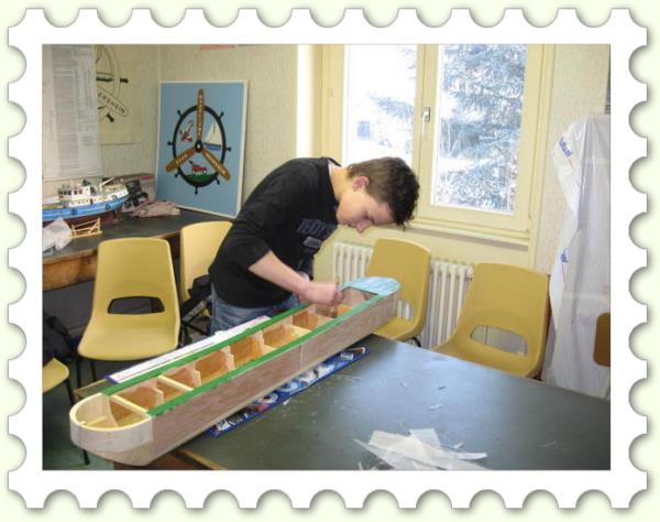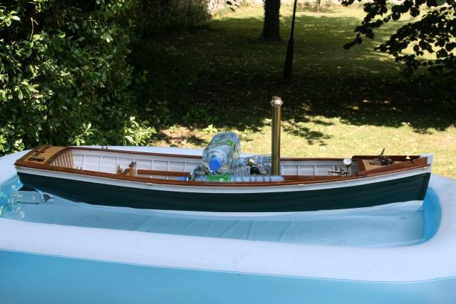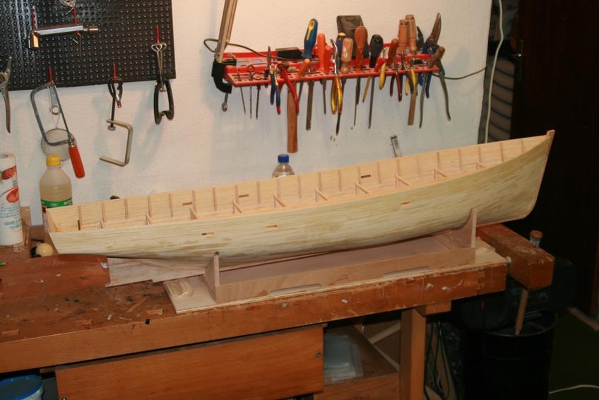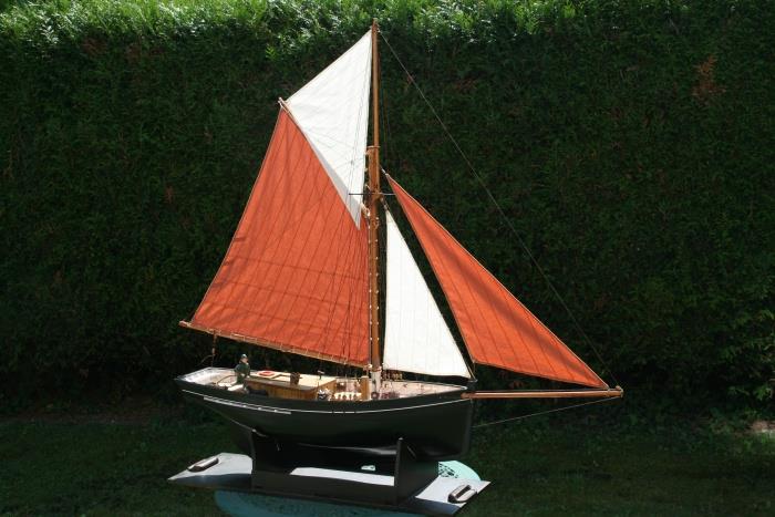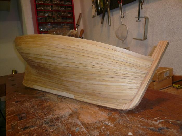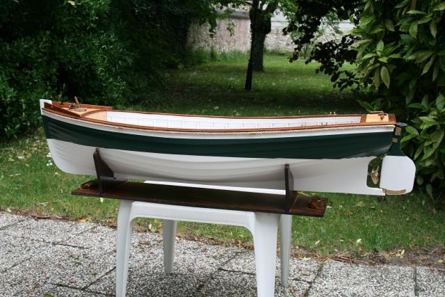 "Voici après ma "Louise" mon dernier bébé : une chaloupe construite à clins. Elle fait actuellement 8200 g et le test réalisé ce week-end montre qu'il faut mettre un lest de 4 à 5 kg. ( Cela correspond au calcul théorique au début de la construction ). Il s'agit d'un plan MRB ( pas prévu à clin ! ) que j'ai un peu agrandi pour arriver à la taille de 125 cm.