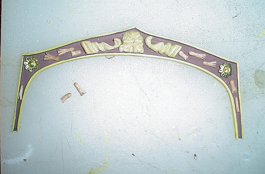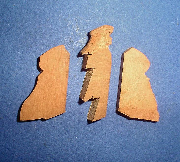 La figure de proue fournie dans les kits est bien souvent trop petite ou inadaptée. Alors, essayons autre chose. |  |  | | La figure de proue est composée de 3 parties découpées dans une planchette de poirier de 6 mm d'épaisseur. Elle viendra s'encastrer au sommet de l'étrave. |