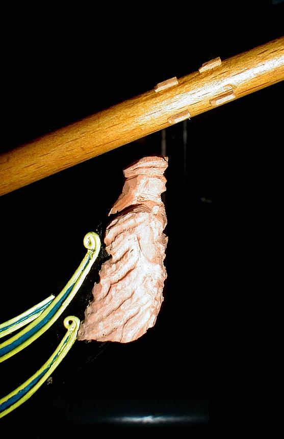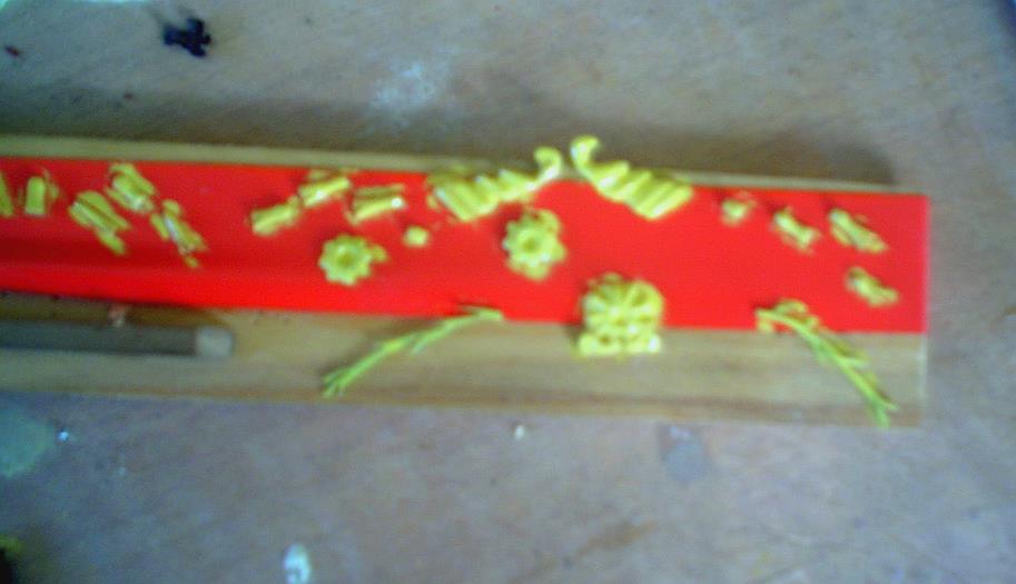 |  | On sculpte de petits éléments dans du buis, on les peint (collant d'électricien pour les maintenir). Les tiges des "fleurs" sont en fil de soudure d'étain travaillé au scalpel. |