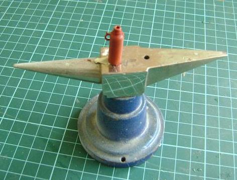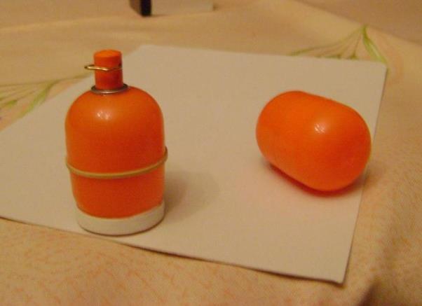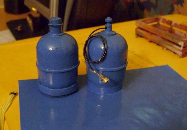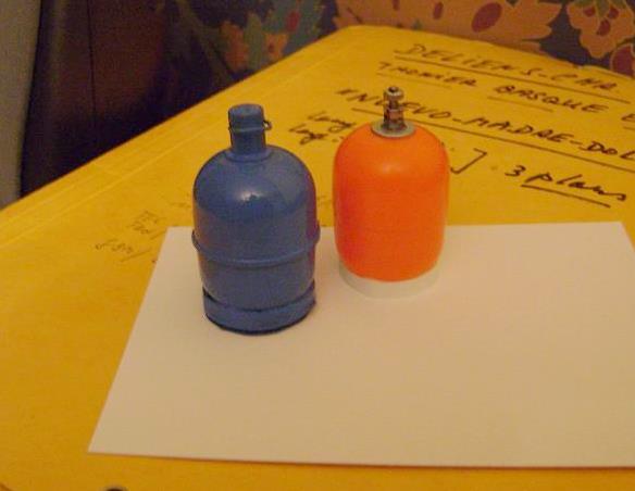 bonbonne de gaz faite avec un "Kinder", une rondelle et un fil de laiton ; le capuchon obtenu avec un morceau de bic : échelle valable pour le 1/10ème et le 1/15ème