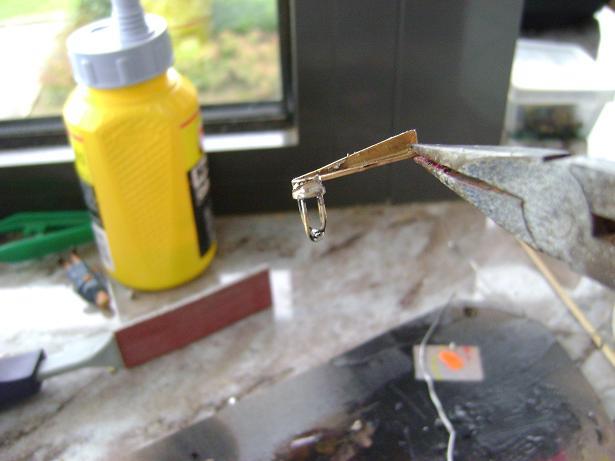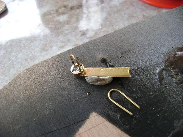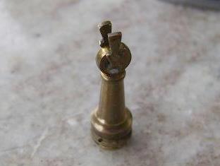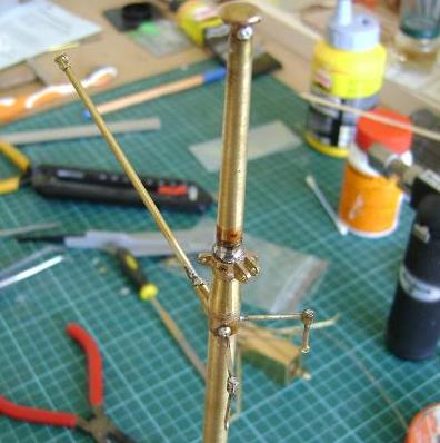 trois photos d'une lanterme de mât pour le Moulay-Idris faite avec du laiton en T un écrou percé de 4 trous de 1mm et du fil de laiton !