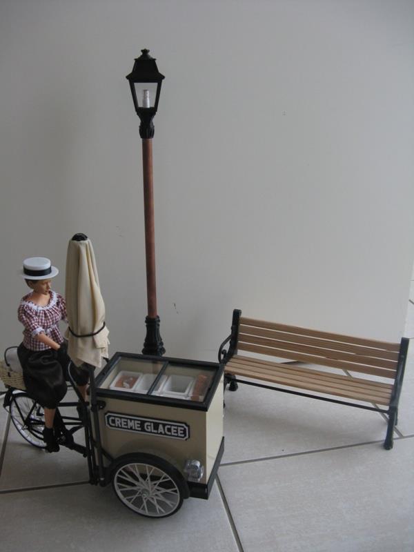 puis la boutique, l'ouvrier avec son diable, la demoiselle avec son livre sur le banc, la boite aux lettres: //Les détails ne sont pas en bois mais en plastique : l'imprimante 3D tourne à plein régime / |