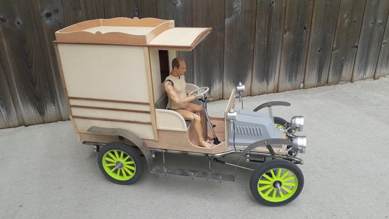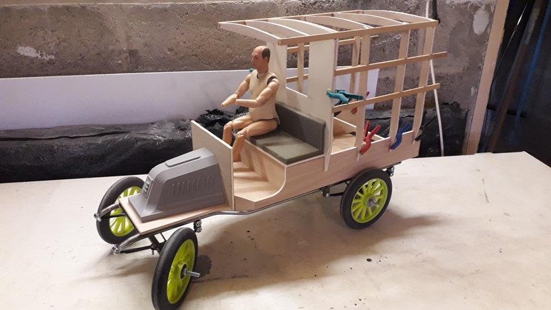 | | Fabrication de la caisse en contre plaqué et latte de bois. le capot moteur est imprimé en 3D. |