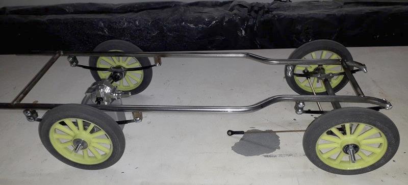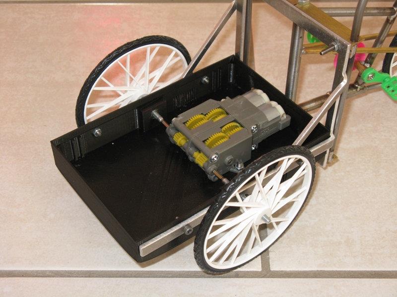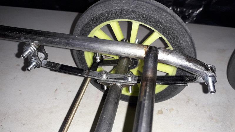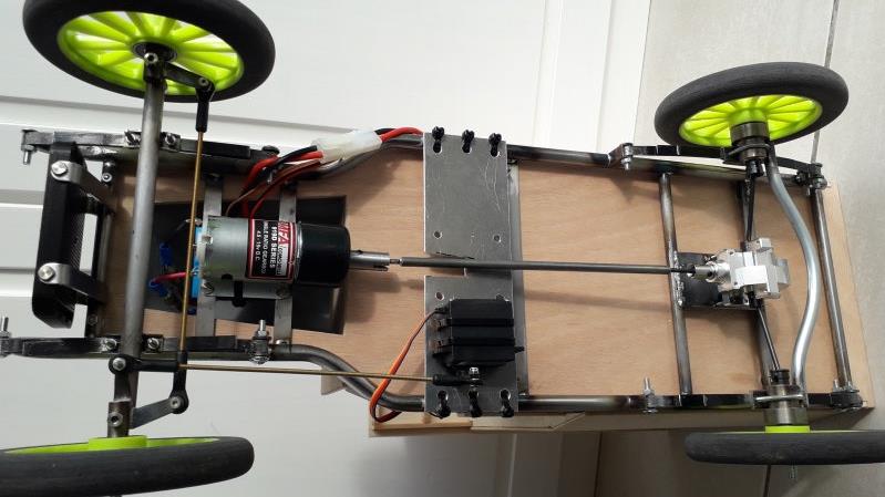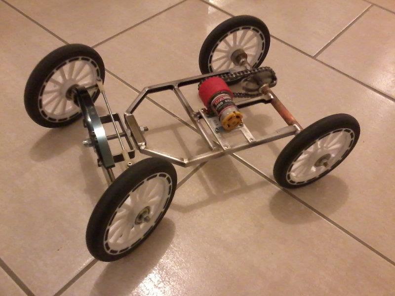 |  | La transmission se fait par chaîne. les roues sont des roues de trottinette repassées au tour pour les réduire en largeur. Au départ, j'avais mis un essieu rigide mais on entendait les roues gratter le sol dans les virages. j'ai donc ensuite adapté un différentiel de voiture rc. |