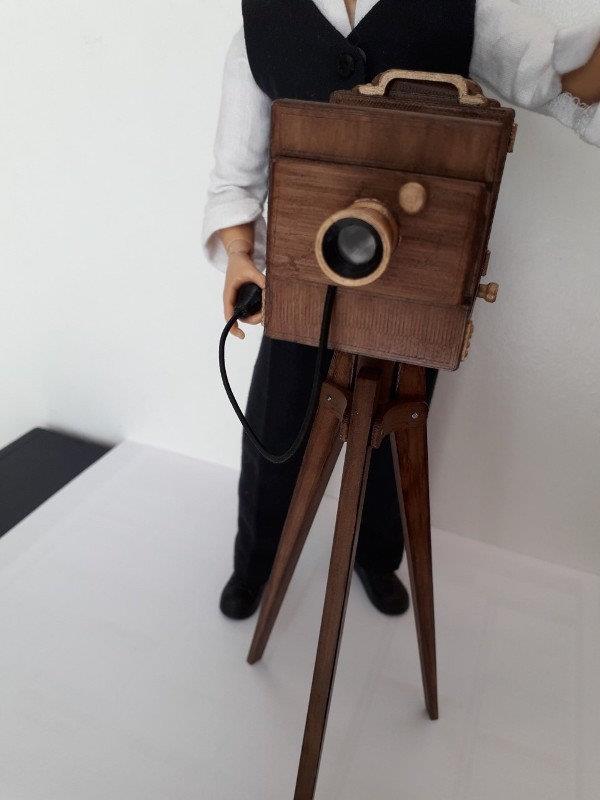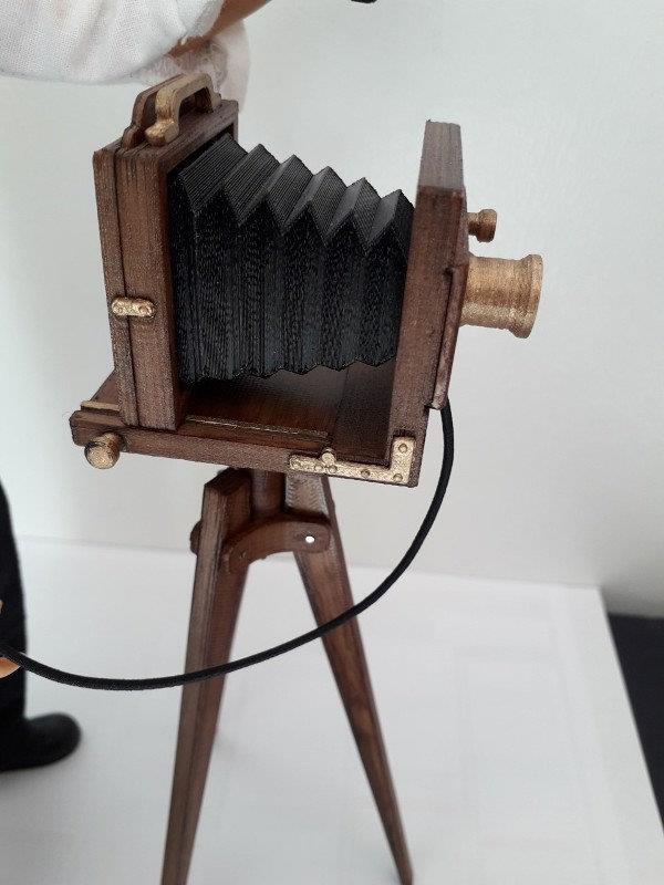 L'appareil photo ainsi que les tonneaux sont imprimés avec du filament bois. De la teinture bois dur passée en 2 couches en faisant des taches leur donne cet aspect. Petite astuce, le remplissage d'une pièce se fait en diagonale donc en positionnant la pièce à 45° on peut respecter le sens du bois. |