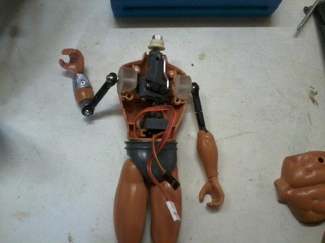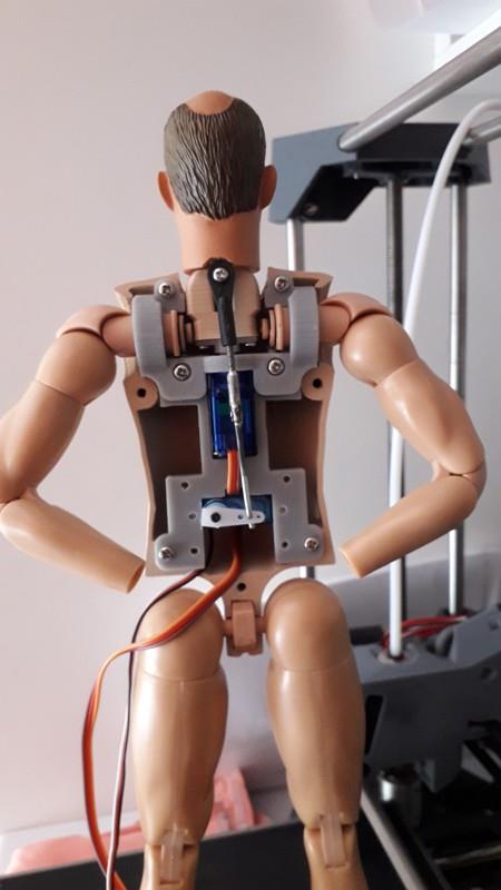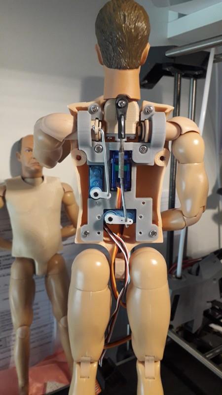 Pour le conducteur de cette camionnette, j'ai acheté une figurine 1/6ème dont je n'ai gardé que les bras et les jambes, le torse est imprimé. J'ai modélisé 2 versions du corps un mince et un plus enveloppé. (Voir i-dessus) A l'intérieur, il y a une platine radio standard pour les 2 versions sur laquelle je peux mettre jusqu'à 4 servos selon mes besoins. 2 pour les mouvements de la tête et 2 pour lever les bras. Ces derniers ne sont pas présents ici : ce sont le volant et le levier de vitesse qui actionnent les bras.