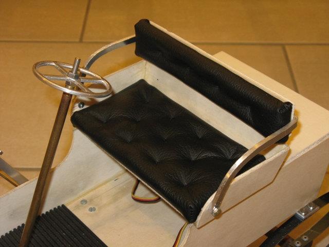 |  | Réalisation de la caisse en ctp de 3mm. Le volant est taillé dans la masse en alu et sera recouvert de cuir. Les lames de ressort sont en feuillard de cerclage de palettes. |