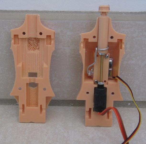 Le mouvement droite et gauche est fait par le servo du bas, le mouvement vertical par l'intermédiaire de la tige métallique qui coulisse le long du support de la tête et actionne une fourchette à l'intérieur.