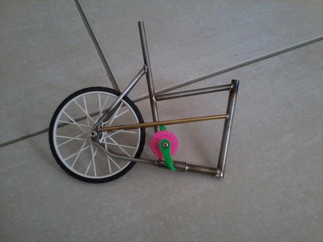 J'ai commencé la construction par le cadre le acier et laiton toujours soudé à l'étain. J'ai commandé 2 vélos "barbie" en chine pour avoir les roues… ça ne m'a coûté que 4€. La structure de la partie avant est découpée dans une tôle alu de 3mm |