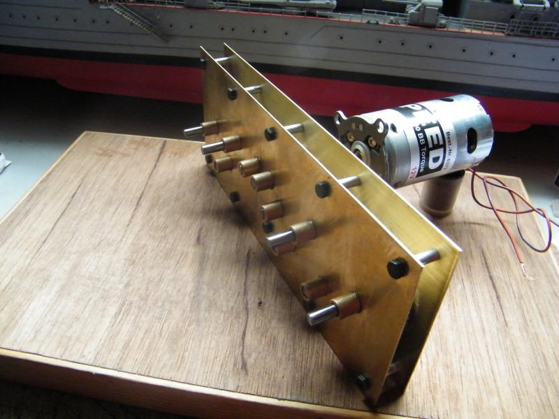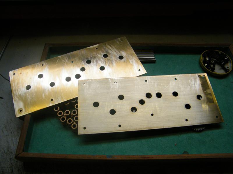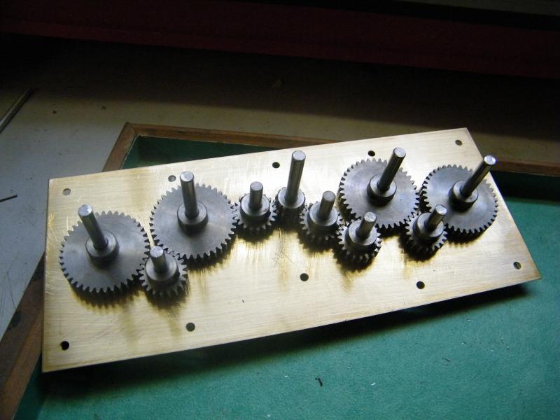 réducteur pour actionner d'une manière réaliste plusieurs hélices | *Les 2 flasques sont en laiton de 1mm, elles seront percées ensemble après traçage au compas à pointes sèches des centres des différents pignons en étant le plus précis possible. L'idéal aurait été d'avoir une table croisée à vernier ,mais ... Sur l'ensemble des 10 trous j'ai eu une petite erreur sur 2 d'entre eux : un peu d'ajustage et ça marche !