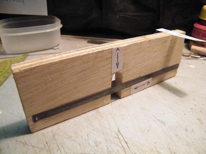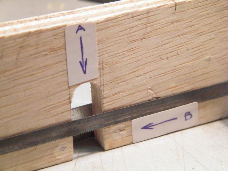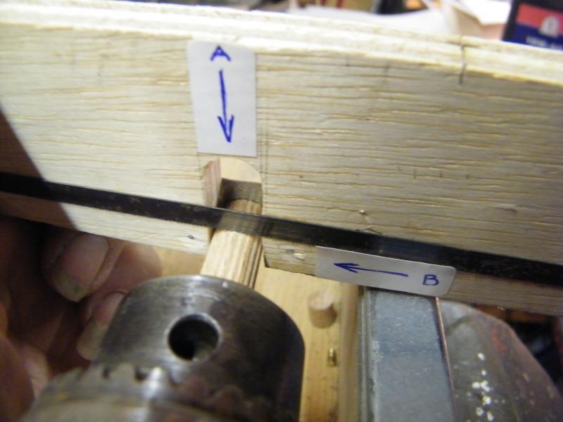 |  | faire un découpe au diamètre des bouts (A) placer une lame de scie de modélisme sur la planchette : sens de la denture vers l'avant ( B )