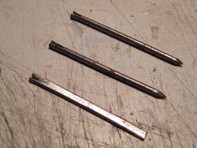 Couper la tête, faire une fente au bout de cet axe (un peu plus large que le diamètre du fil, façonner la forme de l'axe en fonction du type d'anneau. ATTENTION : les axes devront être de section inférieure a la forme finale de l'anneau : suite à l'élasticité du métal ,le fil torsadé autour de l'axe se détend et augmente de diamètre IMPORTANT : pour la forme rectangulaire aplatir un peu au marteau sur chaque grand coté avant desserrage du fil enroulé sur l'axe .sinon l'ensemble se coince et rend impossible le démontage !