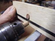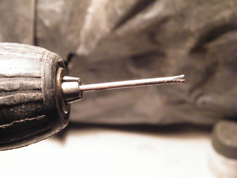 | Loger cet axe , la pointe à l'intérieur, dans le mandrin d'une perceuse sans fil avec variateur de vitesses. |