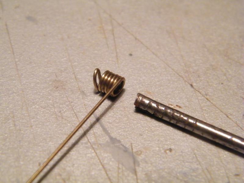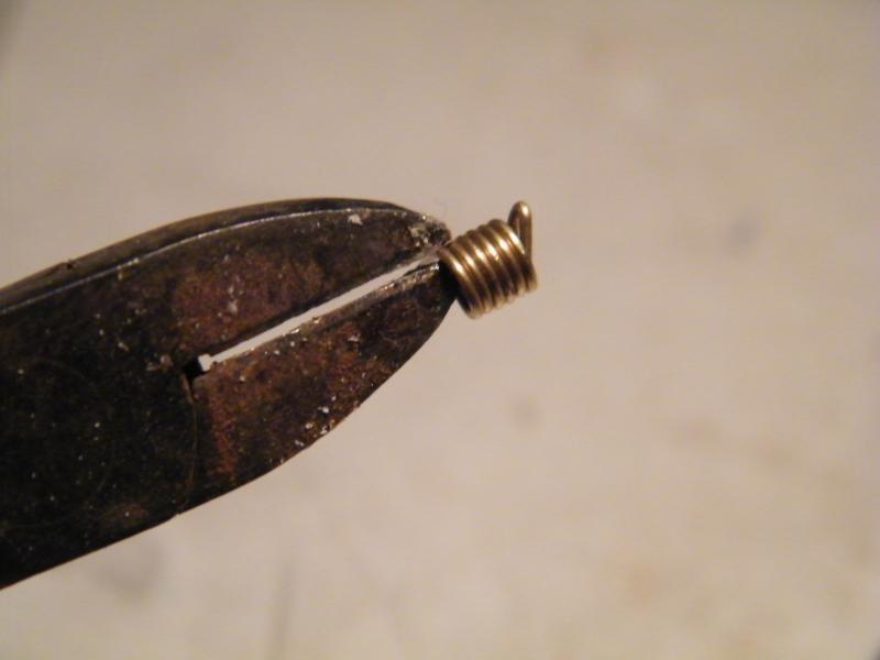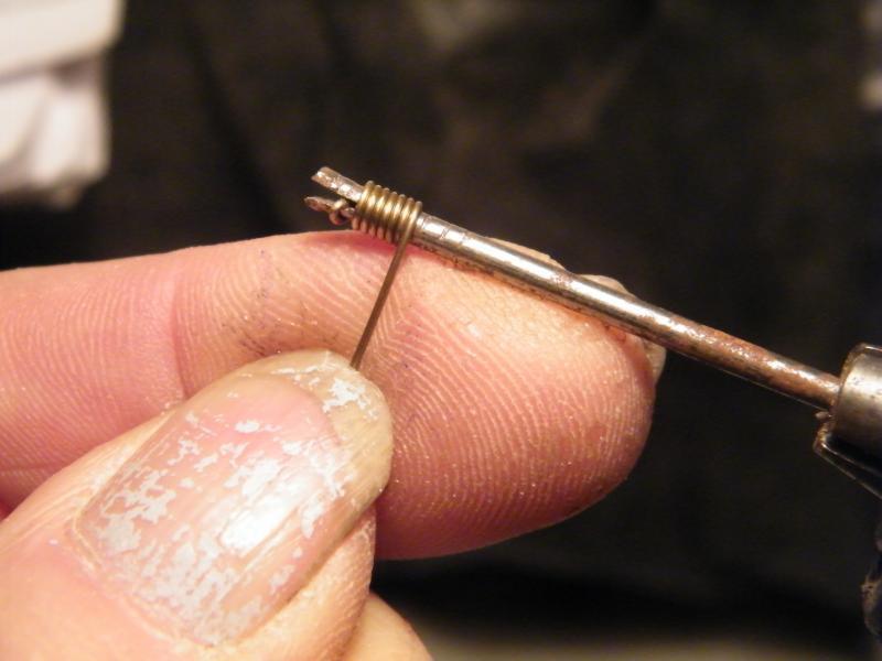 | Faire dépasser l'axe de 20 à 30 mm, engager le fil de laiton ou de cuivre dans la fente, faire tourner la perceuse en rotation lente, laisser " aller " le fil en maintenant une certaine tension et en faisant des spires jointives. |
