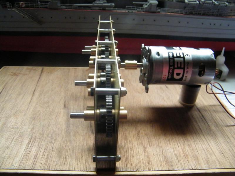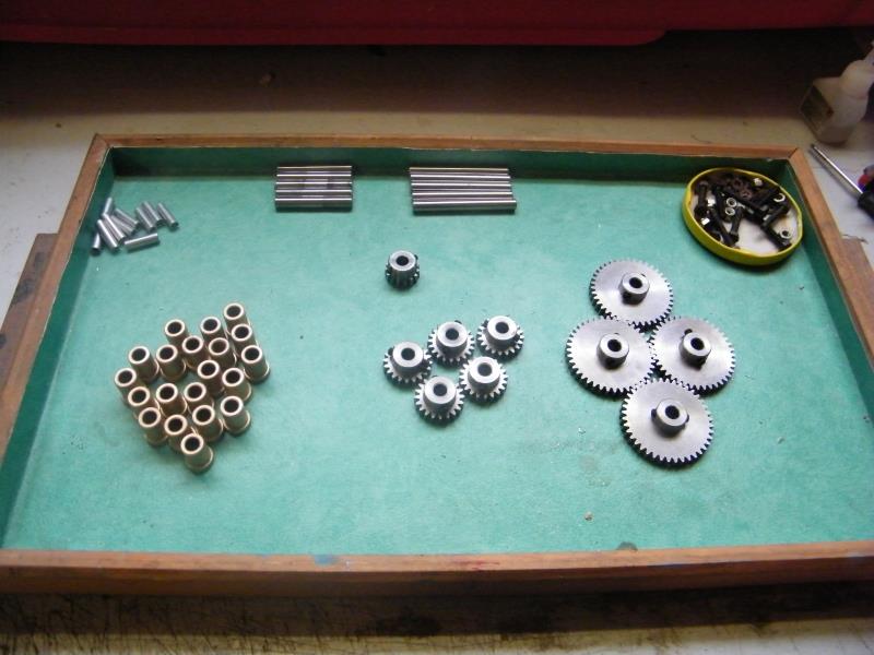 Matériel : 1 moteur SPEED 900 BB TORQUE 12 V 6500 tr/mn. 1 Accouplement rigide 6/6. Les pignons sont en acier d'épaisseur 6, alésage de 6, blocage par 2 vis de 4. Les axes sont en acier de 6 : plus court pour les satellites et plus long pour le moteur et les récepteurs . 1 pignon moteur de 15 dents. 5 pignons satellites de 20 dents. 4 pignons récepteur de 40 dents. 20 Paliers bronze. 10 entretoises en tube Alu de 5. … de la visserie de 4 avec écrous frein. Prévoir 4 cardans articulés en sortie.