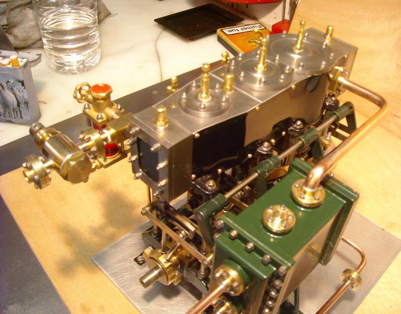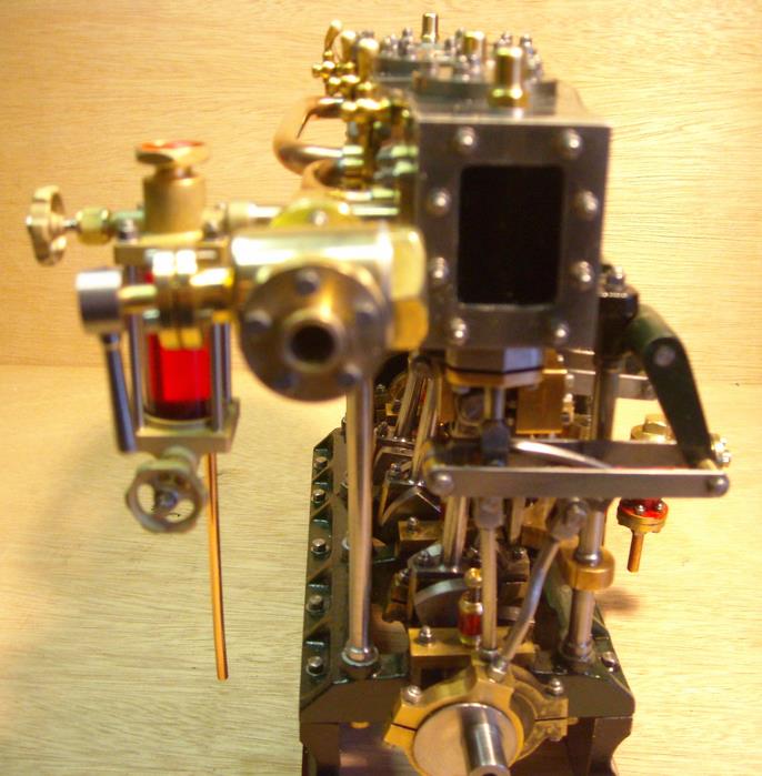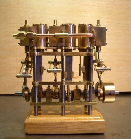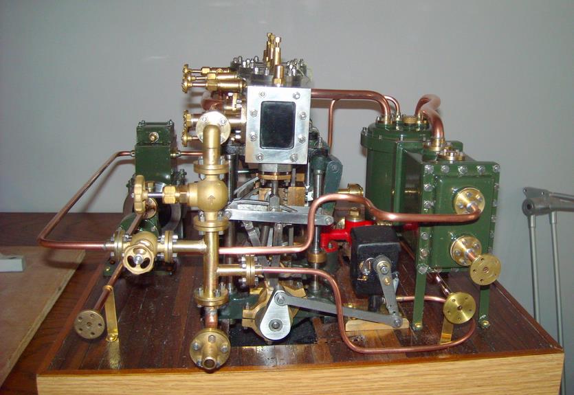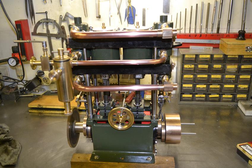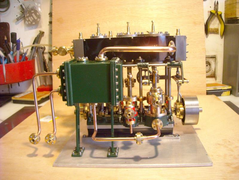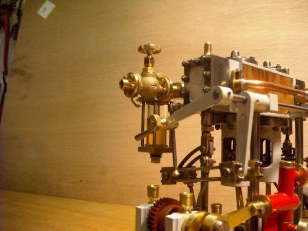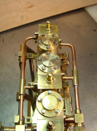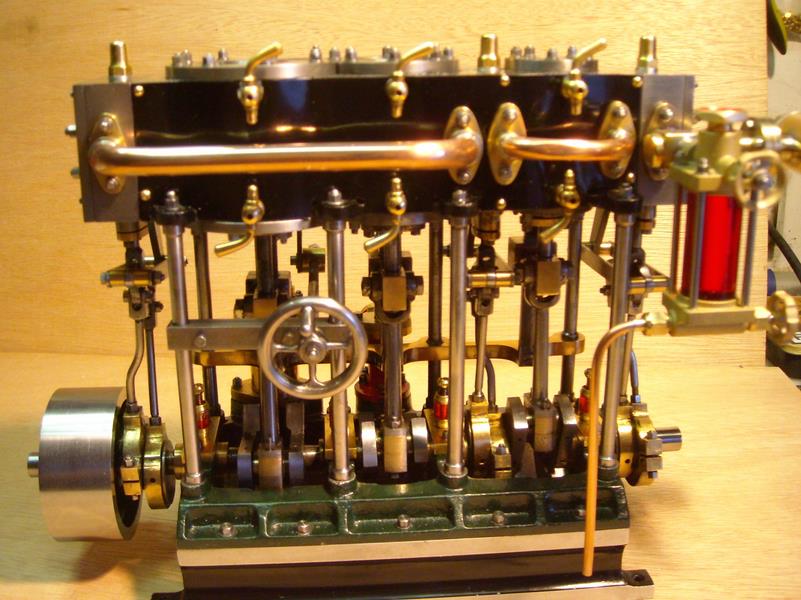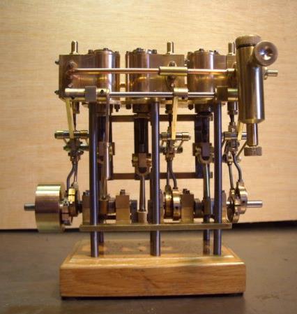 moteur stuart triple expansion double effet compound avec pompe à air et pompe à eau alésages . 1er haute pression : 19,05 piston en fonte avec 3 segments . 2 ème moyenne pression : 31,75 piston en fonte avec 3 segments . 3ème basse pression 44,45 piston en fonte avec 1 gros segment course 25,4 4 graisseurs goutte à goutte en verre pour le vilebrequin 1 graisseur en verre pour l'alimentation à 6 bars maxi