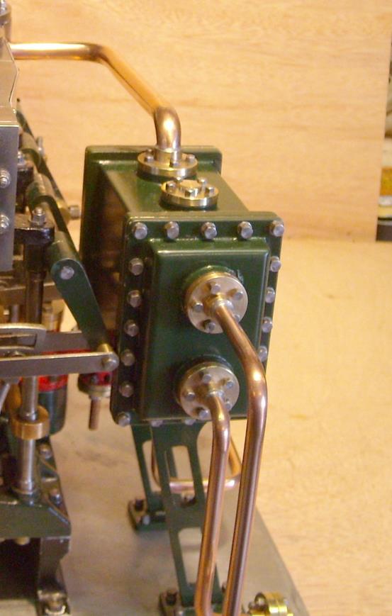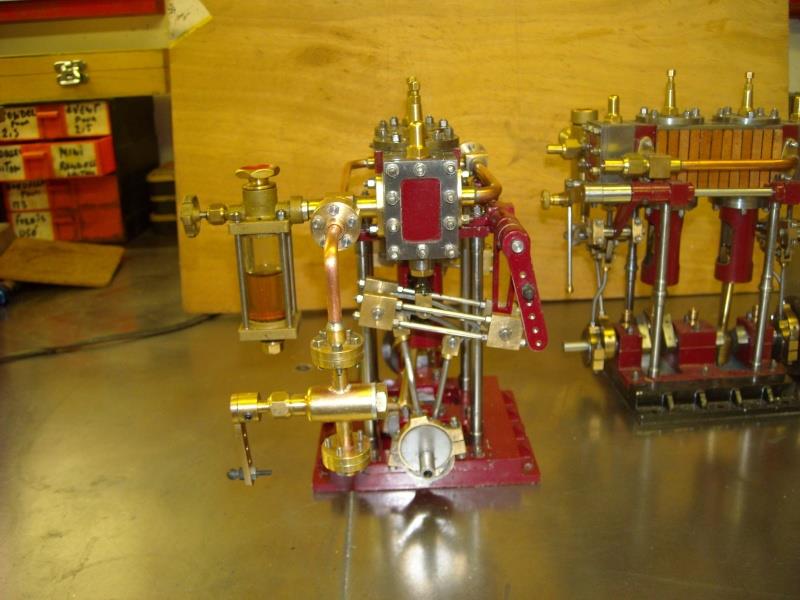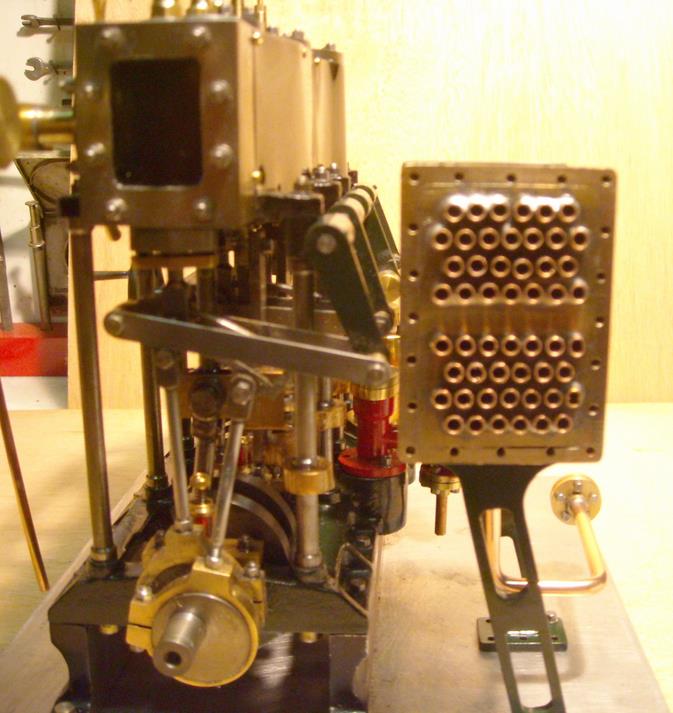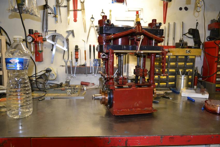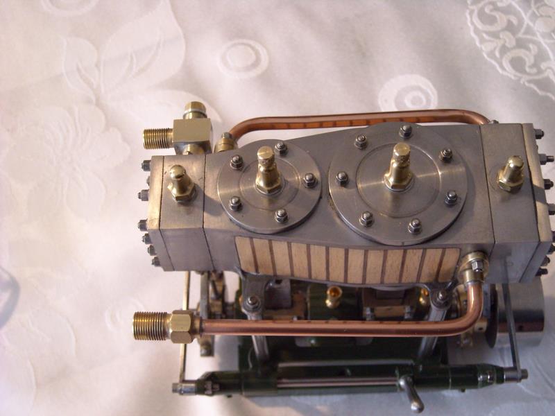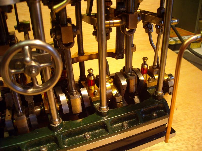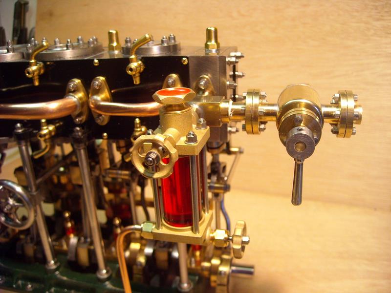moteur stuart triple expansion double effet compound avec pompe à air et pompe à eau alésages . 1er haute pression : 19,05 piston en fonte avec 3 segments . 2 ème moyenne pression : 31,75 piston en fonte avec 3 segments . 3ème basse pression 44,45 piston en fonte avec 1 gros segment course 25,4 4 graisseurs goutte à goutte en verre pour le vilebrequin 1 graisseur en verre pour l'alimentation à 6 bars maxi