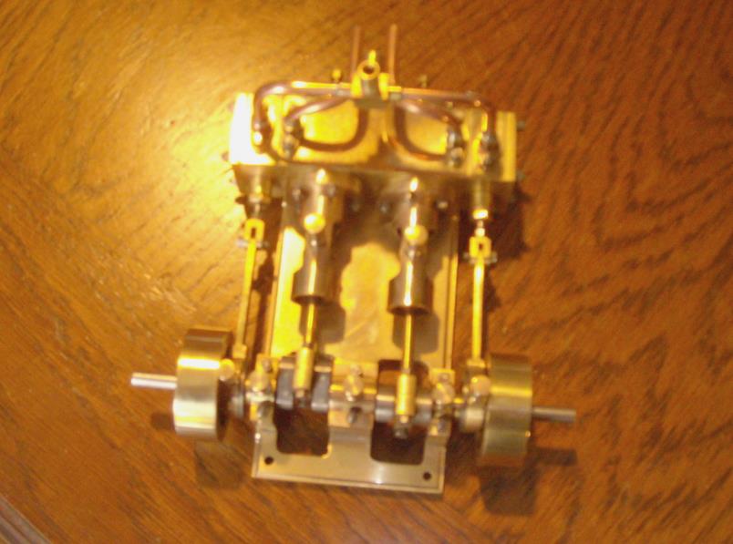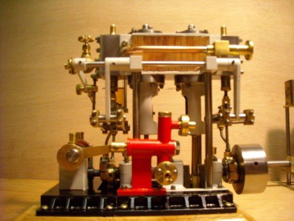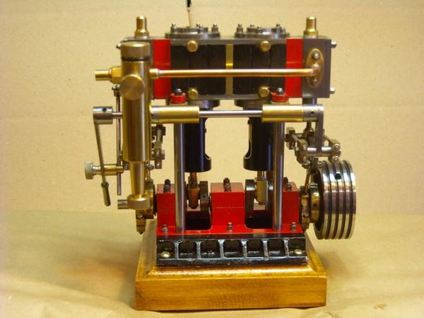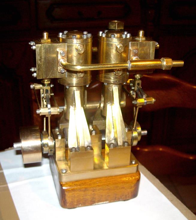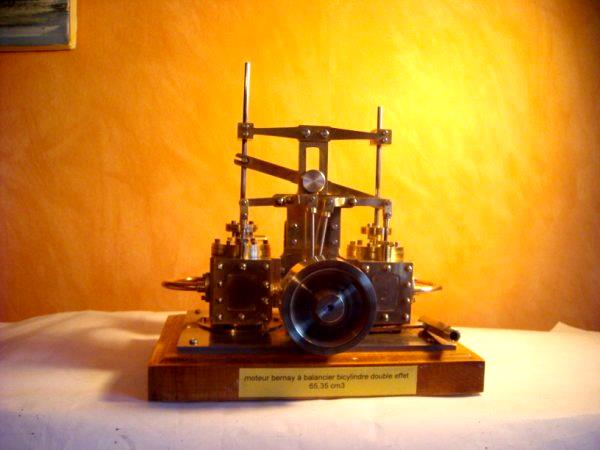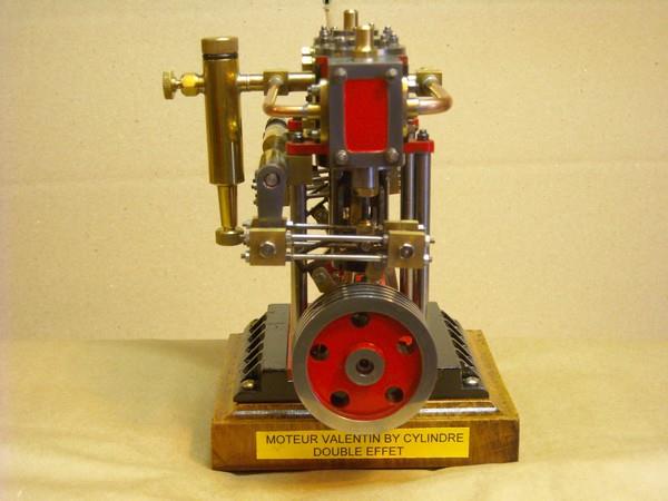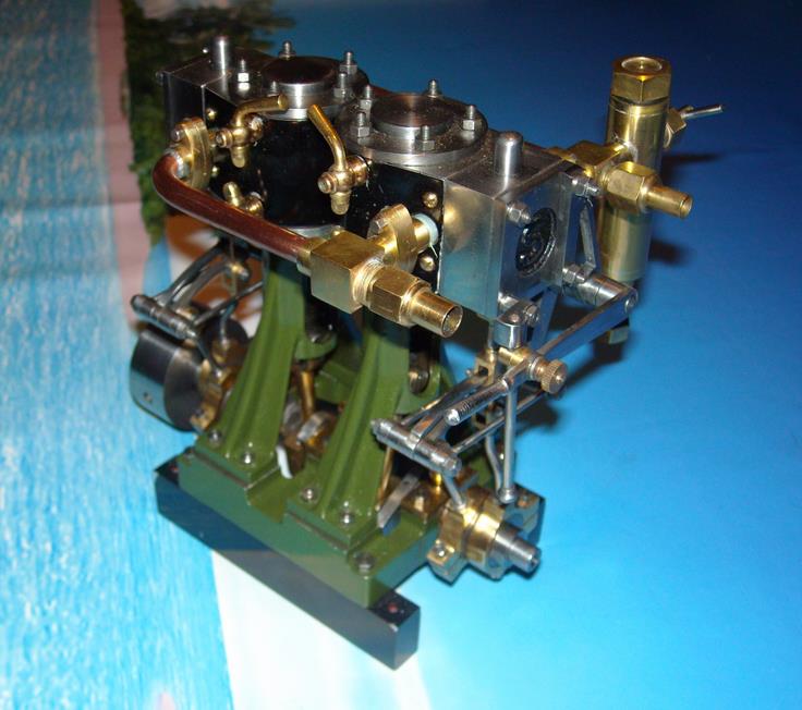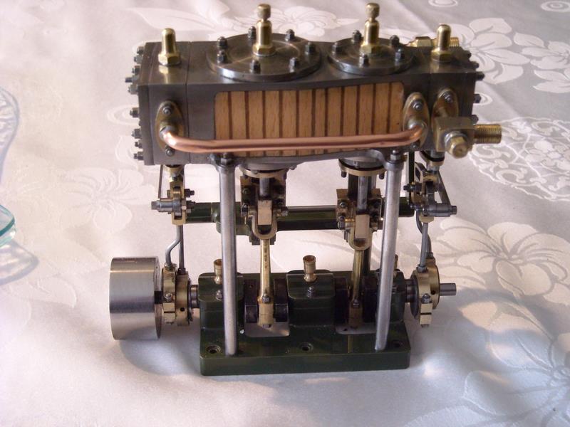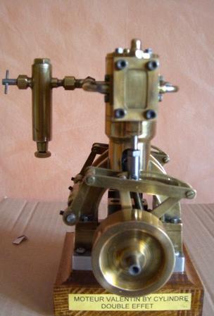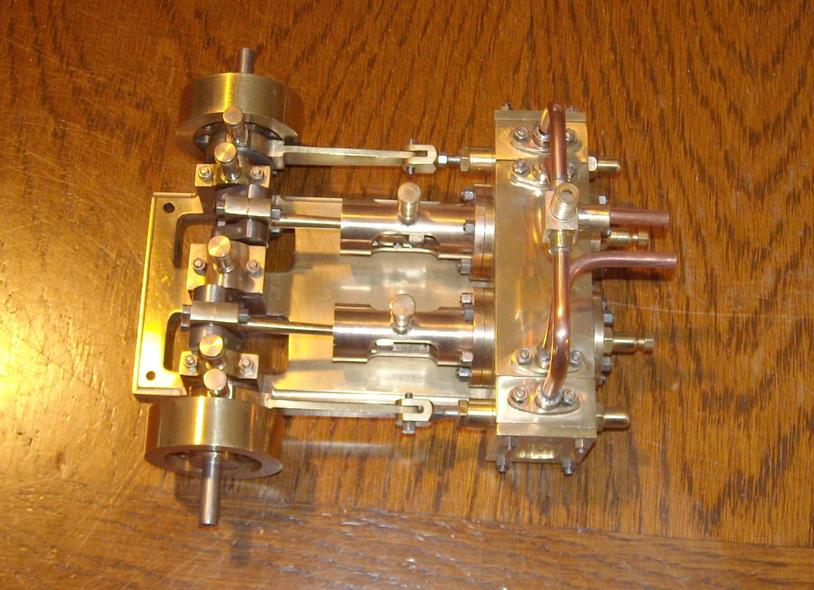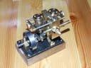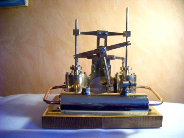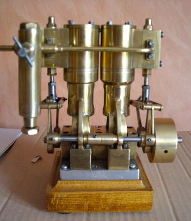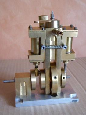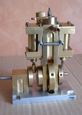 Voici un modèle très réussi et tout petit : mini moteur bi-cylindre double effet à tiroir plan alésage 9 mm course 9 mm longueur 70 mm largeeur 58 mm hauteur 33 mm poids 304 g .