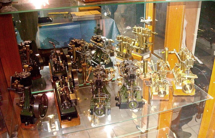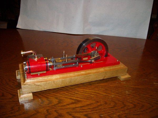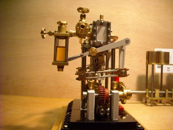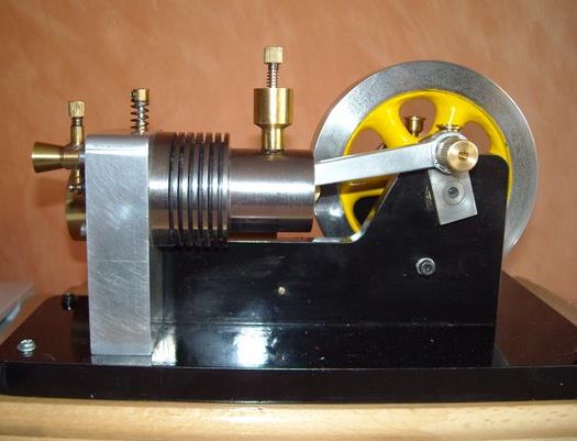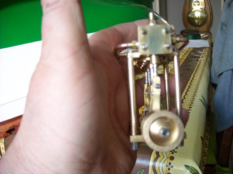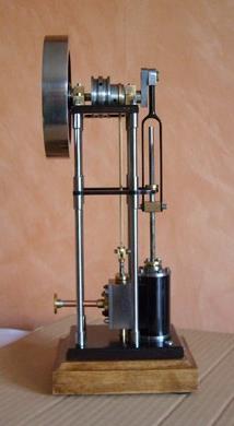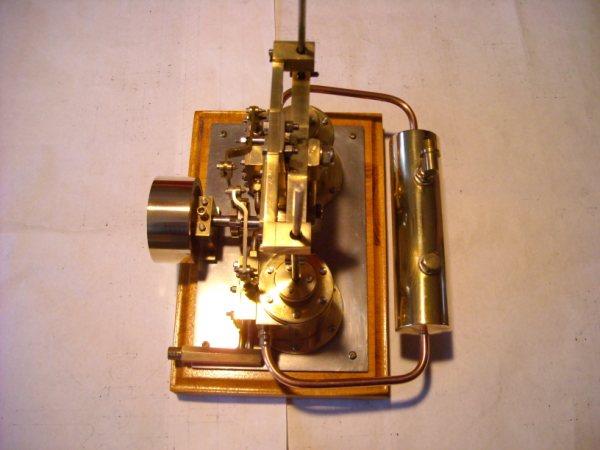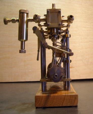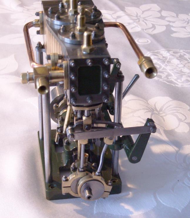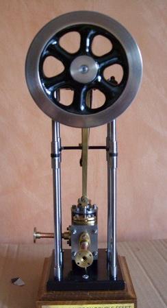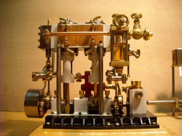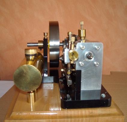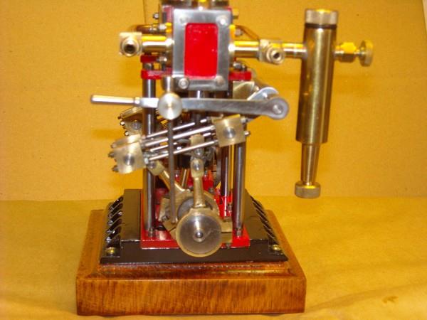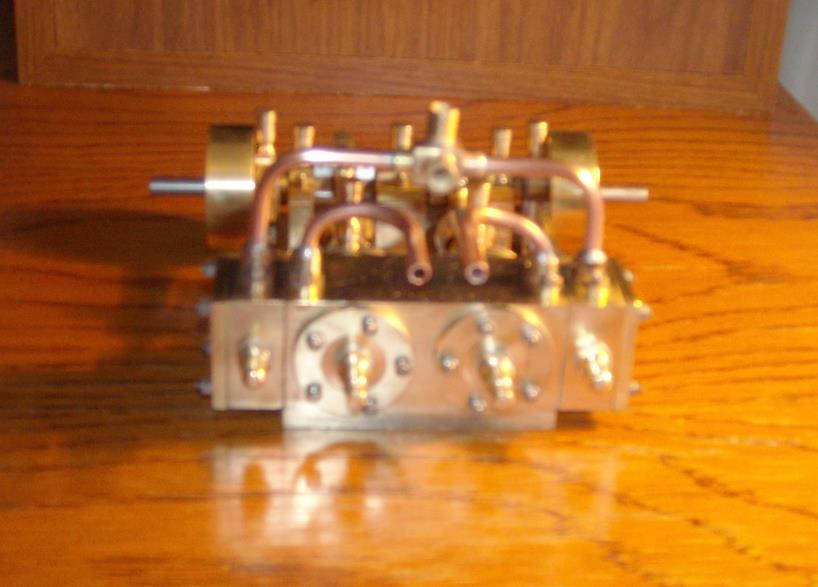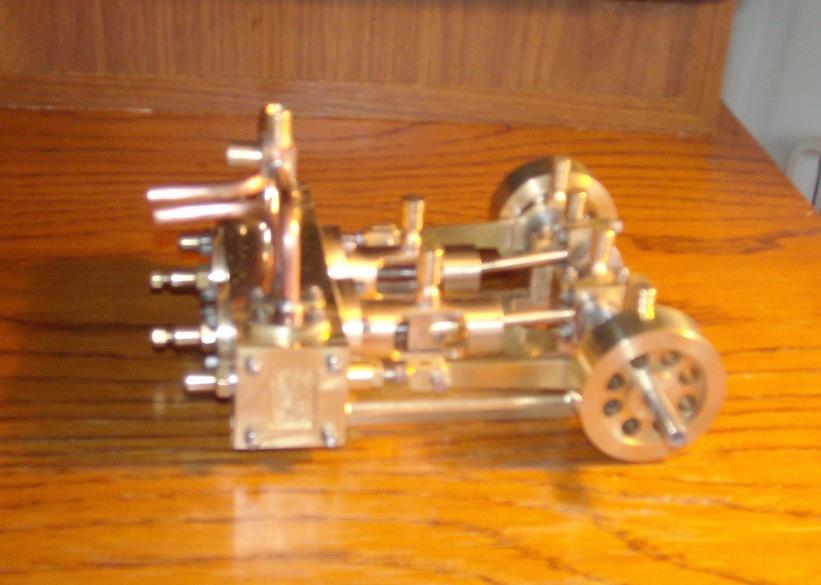 Voici un modèle très réussi et tout petit : mini moteur bi-cylindre double effet à tiroir plan alésage 9 mm course 9 mm longueur 70 mm largeeur 58 mm hauteur 33 mm poids 304 g .