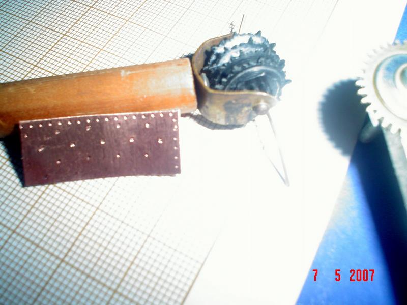 le prototypePour le HMVA BOUNTY qui demanderait environ 1800 plaques (en réalité il n'en faudra que 1300), j'ai essayé de mettre en oeuvre une molette à roues multiples dont voici le prototype.