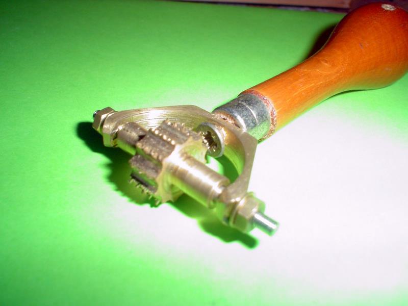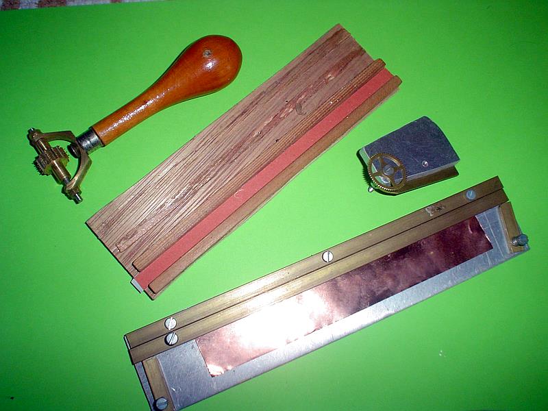 le matériel annexeLa molette montée sur un axe de 3 mm. Le guide de roulement: 2 baguettes de 5x5mm séparées de 7 mm; dans le fond des bandes de papier ou carton pour obtenir le marquage exact de la bande de cuivre, bandes qu'il faudra changer dès que le marquage y deviendra prononcé. La roue dentée pour marquer le bord de la bande avec un guide à 5 mm pour éviter un déplacement latéral. Le guide de coupe des bandes de cuivre au cutter: petit ressort pour la pression et taquets de blocage sur une plaque d'alu - ainsi on obtient une coupe vraiment franche sans petites "frisures" qui apparaissent généralement sur un chantier en bois. |