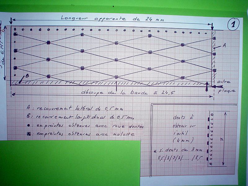 amélioration des accessoires1 - chantier de découpe: pas de changement 2 - chemin de roulage collage de papier de verre de 4 ou 500 sur les tasseaux pour éviter les dérapages 3 - roue dentée qu'il faudra resserrer de temps en temps. Un des bords a été limé pour que le marquage se fasse à l'intérieur de la bande ! 4 - règle de plastique transparent et roulette plus pratique que le pouce ou le réglet pour "écraser" la bande; ainsi on voit si tous les "clous" apparaissent. 5 - des brucelles pour la manipulation (il faut l'utiliser pour enlever les bandes du chemin de roulage sinon on risque de voir le papier se détacher du cuivre) et pointeau: il peut arriver qu'un "clou" ou deux manquent à l'appel (passage trop rapide ou pression inégale). Il vaut mieux vérifier avant le roulage.