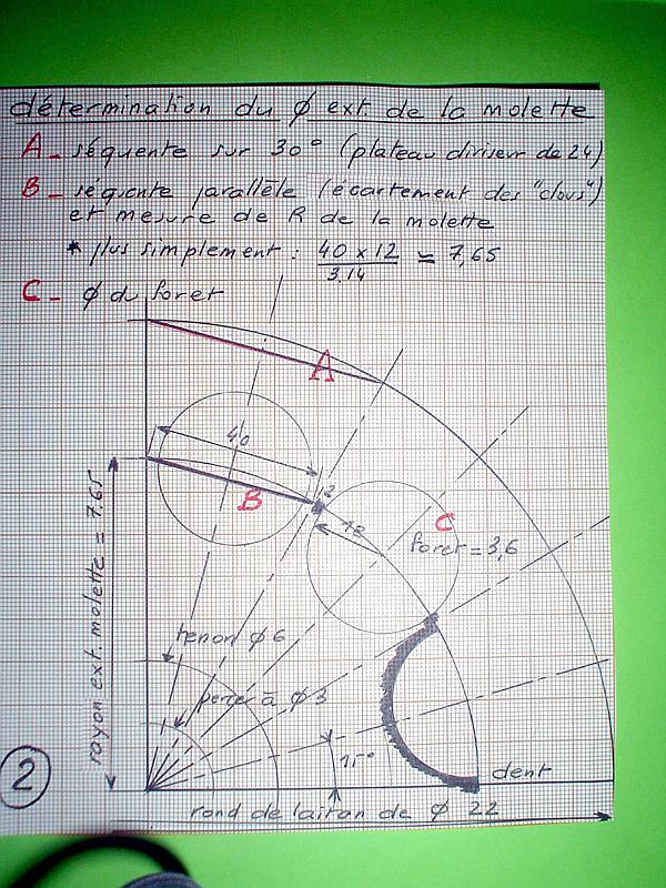 détermination du diamètre de la moletteCroquis montrant le principe de détermination du diamètre extérieur de la molette et du diamètre des trous à percer. J'ai retenu l'obtention de "dents" de 0.4 mm au carré. On peut se contenter, surtout longitudinalement, de pointes de 0.5 mm car il est possible de les retravailler ensuite à la lime. Pour d'autres plaques et d'autres échelles, il faudra déterminer d'autres diamètres : tout dépendra de l'écartement des "clous". |