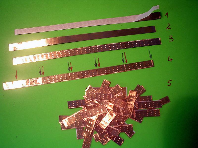 du matériau aux plaques1 et 2 - cuivre autocollant découpé en bande (vente par correspondance chez CONRAD: sachet de 10 pièces de 3.5 x 15 cm, épaisseur 0.035) 3 - bande obtenue après le passage de la molette et de la roue dentée 4 -empreinte transversale obtenue avec une roue dentée; on écrase ensuite en retournant, papier vers soi; 2 flèches montrent les découpes: à ras des clous rapprochés, à 0.5 mm vers l'extérieur des autres 5 - plaques obtenues.
