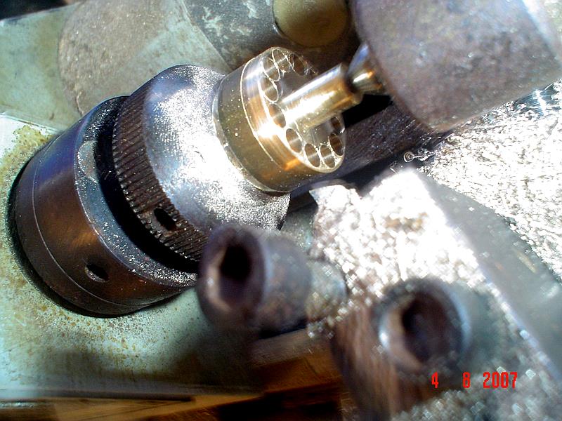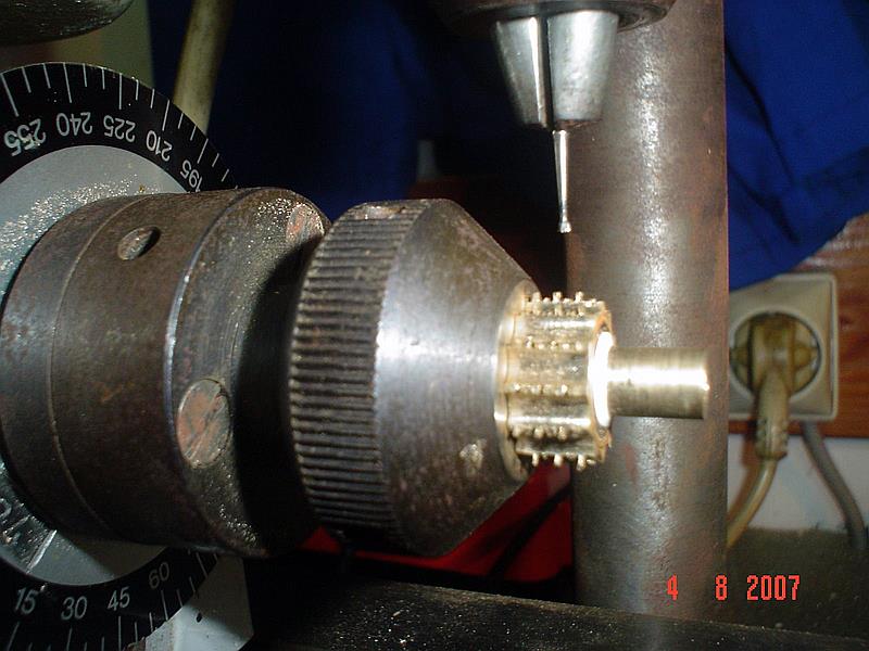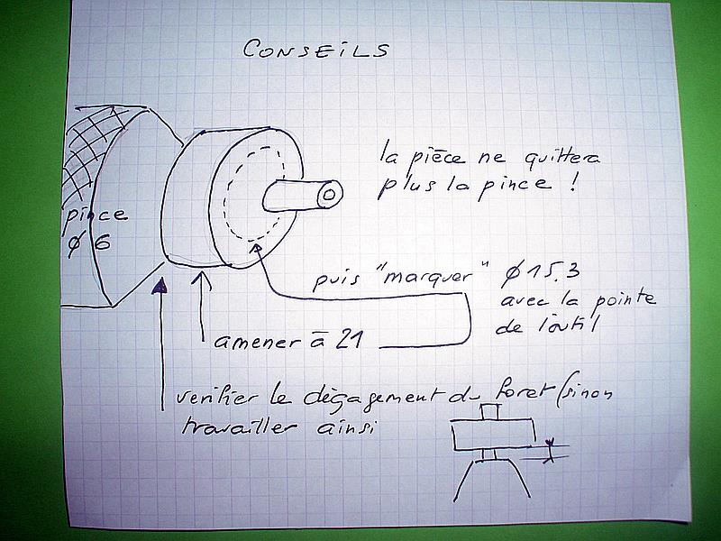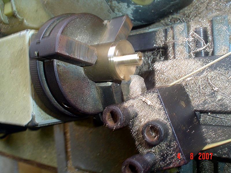 usinageRond de laiton de diamètre approprié (prévoir 1 ou 2 mm de plus que le diamètre de la molette augmenté d'un 1/2 diamètre du foret) . Obtention d'un tenon de diamètre 6 et de longueur 8 ou 10 mm..