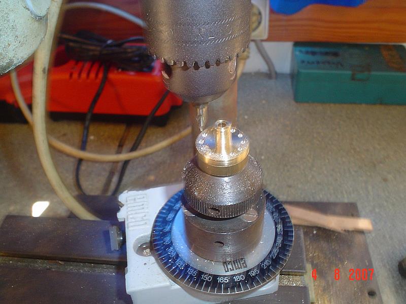 perçageLa pince (ou le mandrin) est placée sur le plateau diviseur (24 graduations). Un coup de foret à centrer puis perçage tous les 30° |