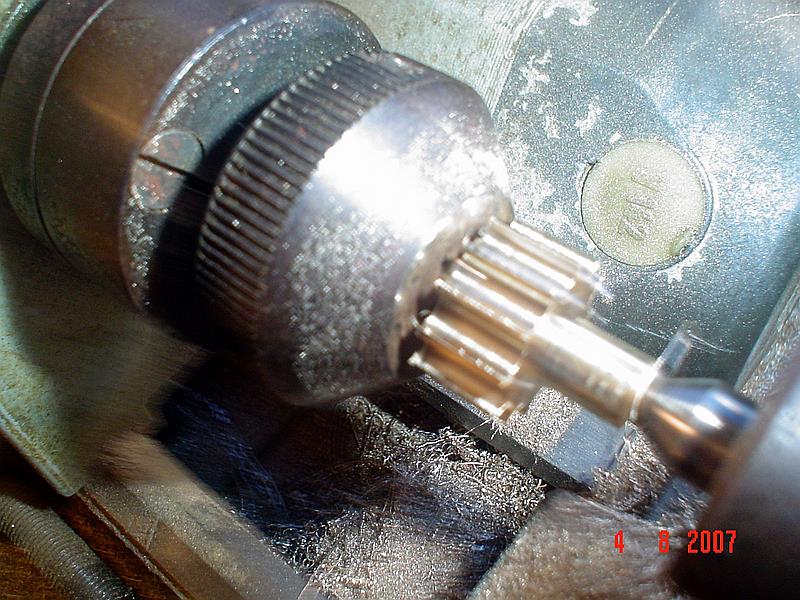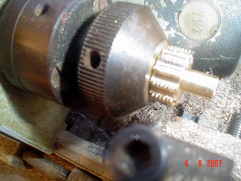 réalisation des dents | Avec un outil à tronçonner, on sépare les rangées de dents. On peut facilement confectionner l'outil à la bonne largeur (ce qui évitera trop de manipulations avec le chariot transversal) en partant d'une lame de scie sauteuse meulée à la bonne dimension. Bien réfléchir aux déplacements qu'on aura à effectuer. On peut descendre de 2 mm; on se ménage ainsi de la profondeur pour le limage. |