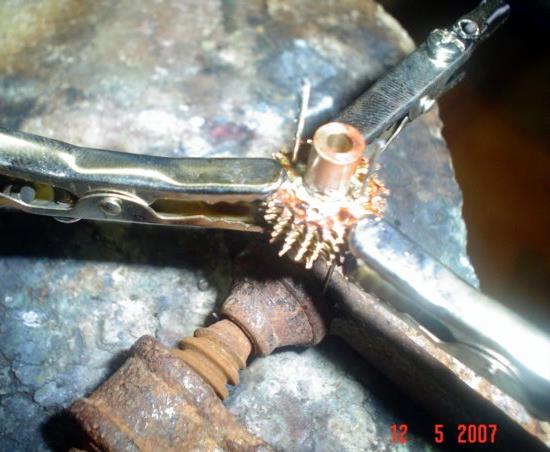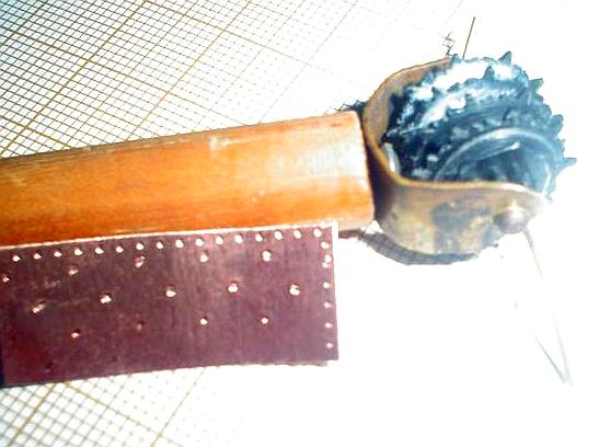 |   soudureSoudure à l'étain : les roues dentées on été empilées sur deux tiges de laiton en alternant un creux, une pointe; l'axe de 6 est enfilé. Bien serrer les roues, enduire de décapant, et ... chauffer juste ce qu'il faut pour que la soudure pénètre. Et on obtient une molette à roues dentées multiples. |
