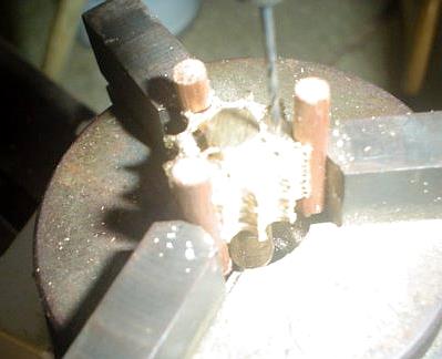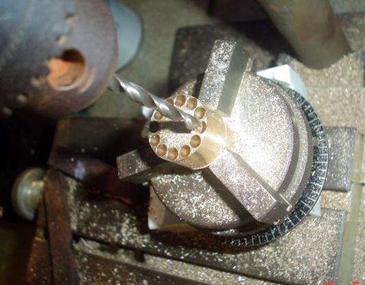 | Perçage sur plateau diviseur. On ne descendra pas jusqu'au bout, le mandrin n'apprécierait pas! 15 mm de perçage suffisent pour obtenir une dizaine de roues dentées. |