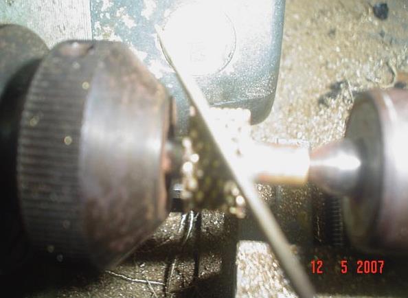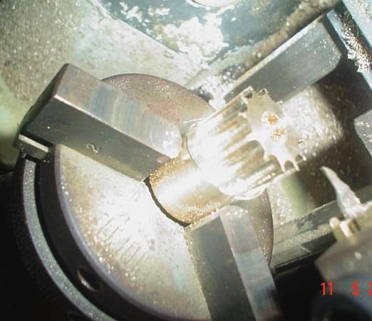 | L'usinage au diamètre de la molette est terminé. En place pour la séparation des roues dentées. Outil "maison" obtenu avec une lame de scie sauteuse. |