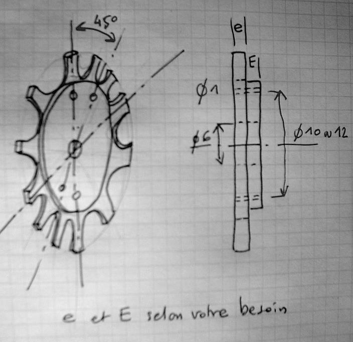 | Un petit croquis plus explicite. Les petits trous serviront pour le décalage des dents. On double donc, par rapport à la molette "compacte" le nombre d'empreintes. |