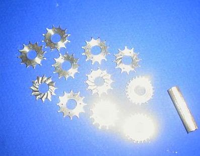 |   roues dentées obtenuesNe pas oublier, lors du tronçonnage de prévoir l'épaulement nécessaire à l'écartement des roues dentées. A droite, l'axe de diamètre 6 lui-même percé à 3. J'ai fait un essai: on peut obtenir des roues dentées dont la largeur des dents n'est que de 0.2 mm! Mais est-ce bien utile (fragilité) sachant qu'on pourra, après la soudure, affiner les dents par limage. En bas, à droite, essai de roues dentées avec 24 dents. Expérience abandonnée, mais tout est possible avec un excellent outillage ! |