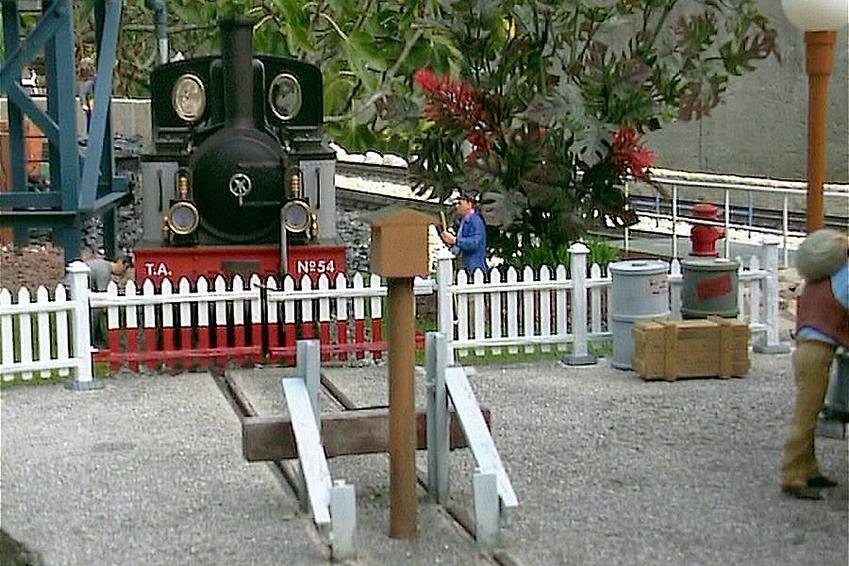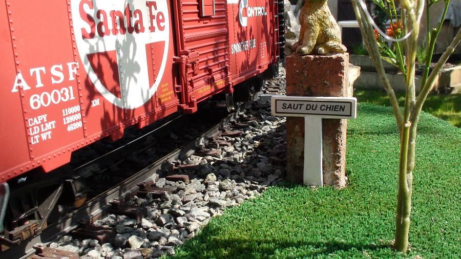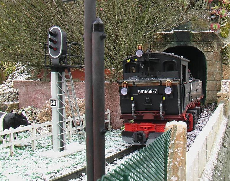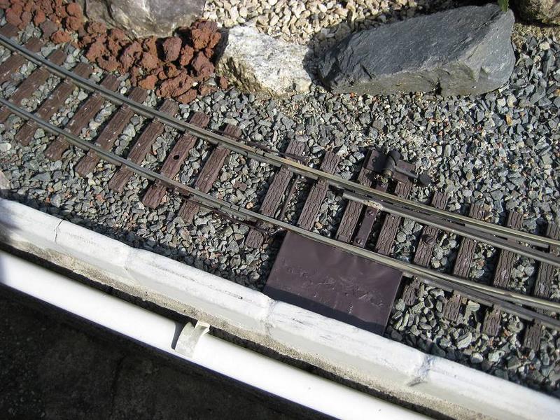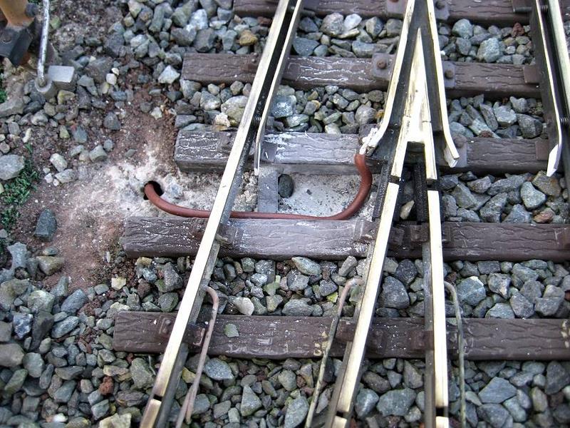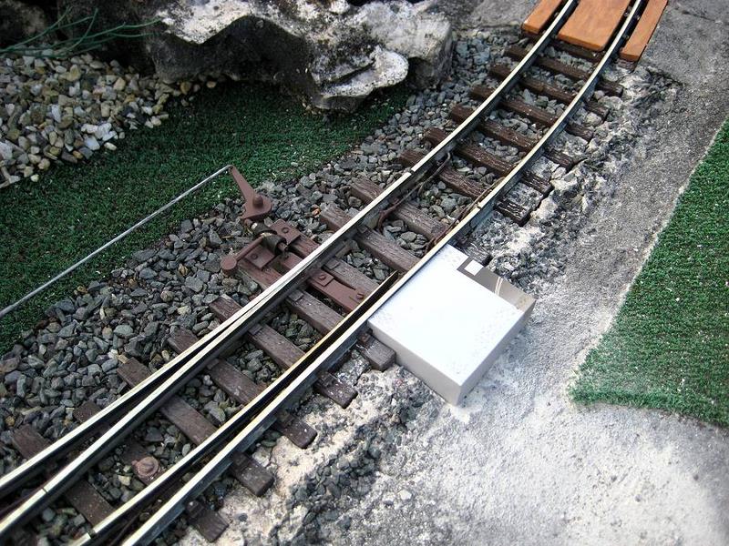 |  | Idem, avec en plus l'électrification de l'aiguillage, qui n'avait jamais été équipé. Devant la loco, le coffret de l'inverseur de polarités, destiné à alimenter le cœur de l'aiguille. A cet endroit la loco de nettoyage de la voie, très lente, calait souvent sur l'aiguillage.
