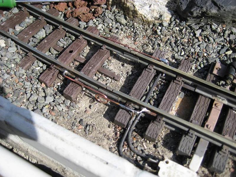 |  | Deux shunts neufs, avec leur boucle de dilatation de 10 mm de diamètre. Ici, ils sont placés à l'extérieur de la voie. On peut voir l'inverseur de l'aiguillage.
