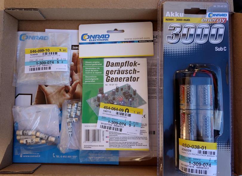 Les fusibles sont pour la maison, au cas où... La batterie 7,2 V, c'est pour le char. Il y a un générateur de bruitage de loco à vapeur, mais surprise... Il est entièrement à monter ! J'avais pas vu ! Il y a aussi des culots BA9S, et des lampes 12 V, 100mA, pour les candélabres du train."