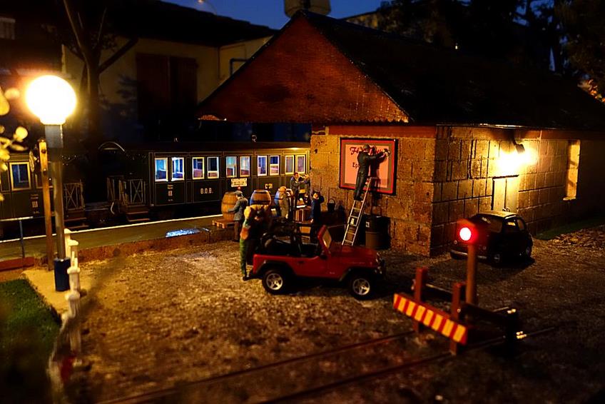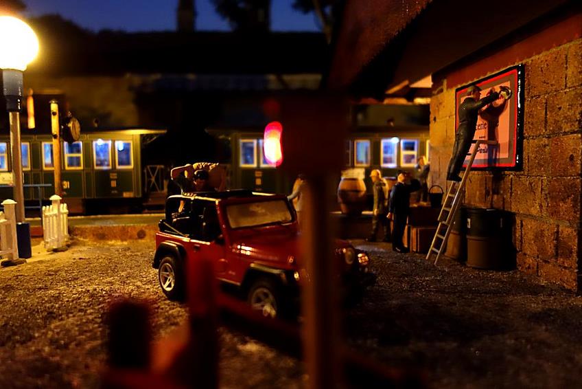 Scène de la vie de tous les jours... Le laveur de vitres nettoie l'affiche toute neuve. Rambarde bleue repeinte, ainsi que la borne "incendie", et barrière blanche et rouge. Buttoir lumineux derrière le wagon, repeint. L'ensemble a pris un coup de jeune !