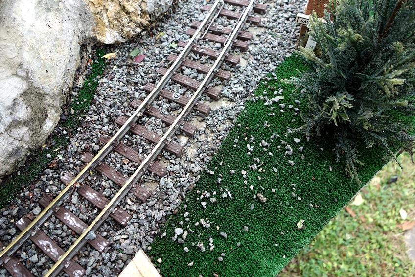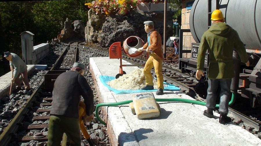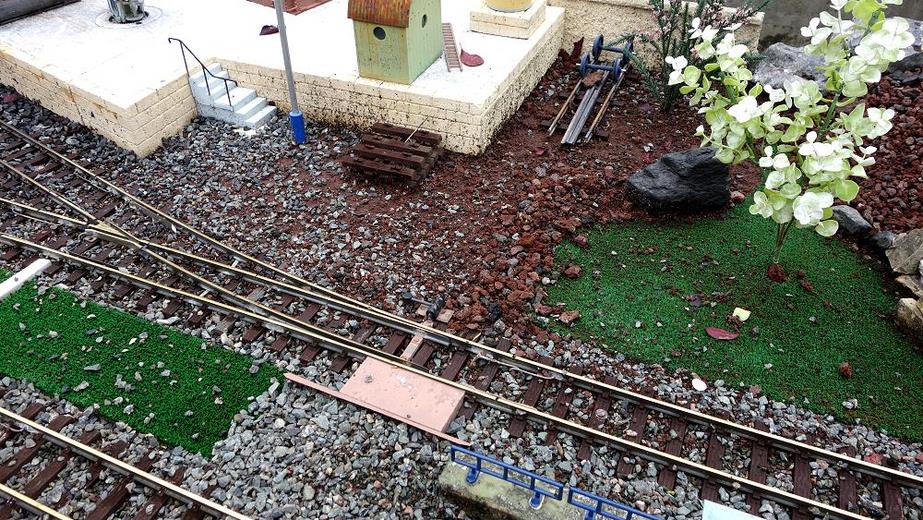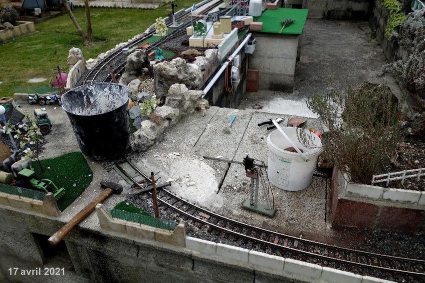 | La bordure du bas a été collée, et le ballast reposé. La clôture est à repeindre. D'autres éléments seront posés plus tard. Le ciment-colle m'a asséché les mains. |
