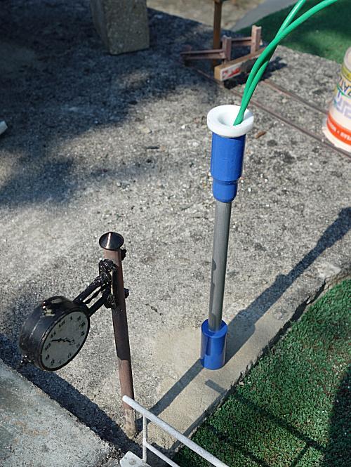 |  | Pour l'autre candélabre de la gare, le support du fût s'est descellé. Scellement refait. Le fût est juste enfilé sur le support. Technique permettant la réparation. Le globe est à refaire, percé, certainement par la grêle. |