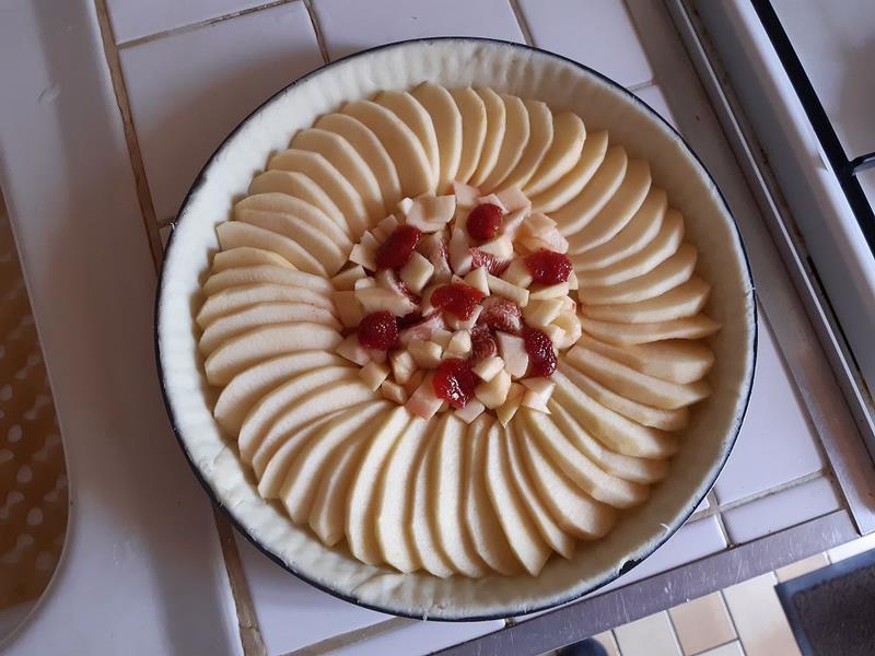 C'est encore une variante... Crue et cuite. Super bonne ! Pomme, figue au milieu dessous, confiture de fraises dessus, et du beurre. |