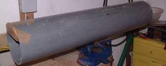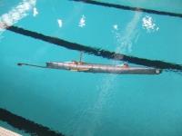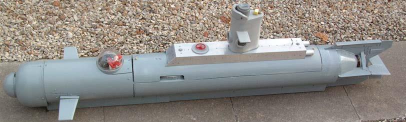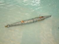 | | Son premier sous-marin : une maquette de type U-Boot dont l'élément principal est un tube de PCV de 200 mm de diamètre. |