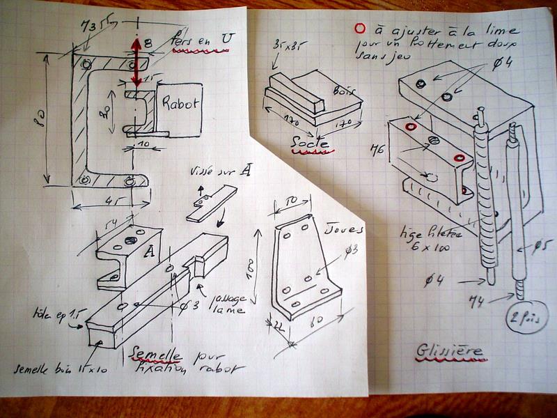 |  | Facile avec cette vue de saisir le principe. La tige filetée centrale de 6 x 100 déplace le chariot porte-rabot de 1 mm par tour. Un bouton ou un disque gradué permet d'obtenir le 1/10ème, voire moins. |