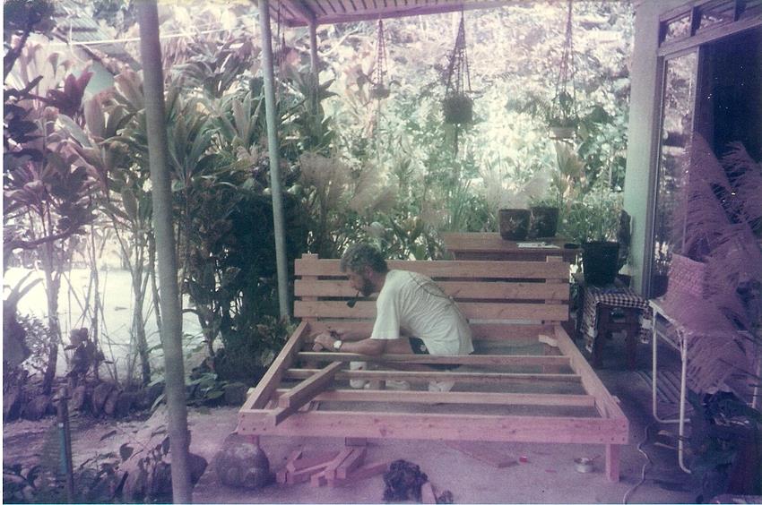 Me voici à Tahaa, en train de fabriquer un lit ... Banal certes, mais ... ... mais ce lit ne nous était pas destiné. Il servirait au Pasteur dont les fidèles, après la construction de sa maison, se chargeaient de la meubler !