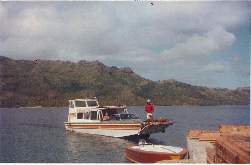 Mais pas évident pour les gros colis ou encore une voiture ... sinon attendre la "goélette". L'imagination polynésienne est toujours au rendez-vous comme le montre cette barge, construite localement et qui pouvait "beacher" n'importe où ... Malheureusement, un jour , le panneau avant s'ouvrît et ... un immense malheur se produisît.